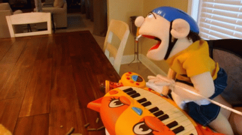 SML's Jeffy puppet, wearing a blue helmet, and Mario puppet are presented with a towering stack of pancakes.