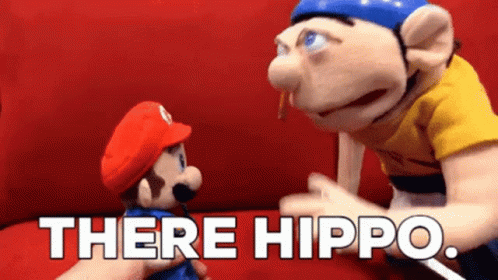 Jeffy puppet points a stick at a Mario puppet with "THERE HIPPO" text overlay.