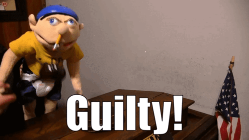 SML character Jeffy, a puppet with a cigarette, stands before a table with an American flag, declaring 'Guilty!'.