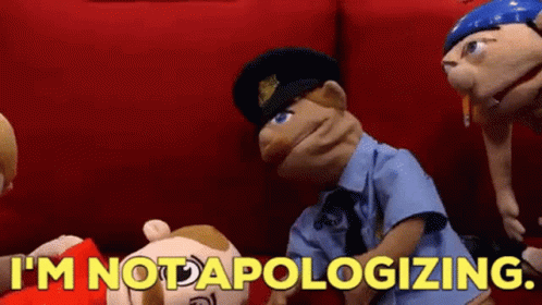 Jeffy from SML (SuperMarioLogan) declares 'I'm not apologizing' while sitting on a red couch with other puppets.