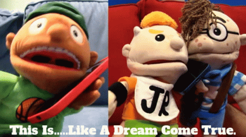 SML character Joseph and friends, including a puppet with 'JR' on his shirt, in a 'Dream Come True' moment.