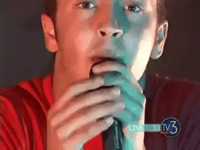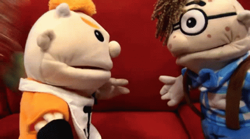 SML character Joseph holds a bag of almonds while sitting on a red couch with other puppets.