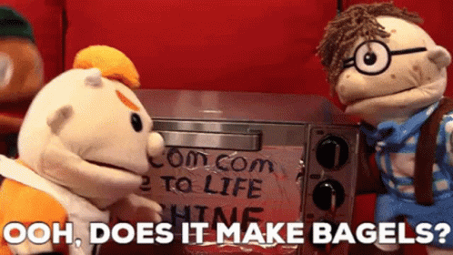 SML Joseph and another puppet examine a toaster oven, wondering if it makes bagels.