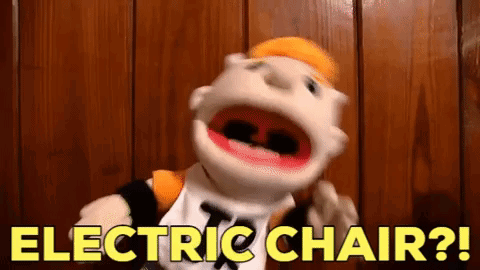 Sml Junior puppet shouts 'Electric Chair?!' with an open mouth against a wooden wall.
