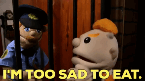 SML Junior, a puppet character, is seen behind bars, stating 'I'm too sad to eat.'
