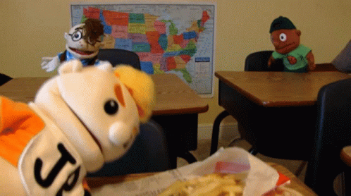 Sml Junior puppet with a McDonald's meal, including fries on a burger, in a classroom setting.
