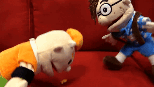 SML Junior and another puppet intently examine a single goldfish cracker on a red couch.