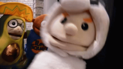 Sml Junior, a puppet, knocks on a door, possibly for Halloween trick-or-treating, with another puppet nearby.