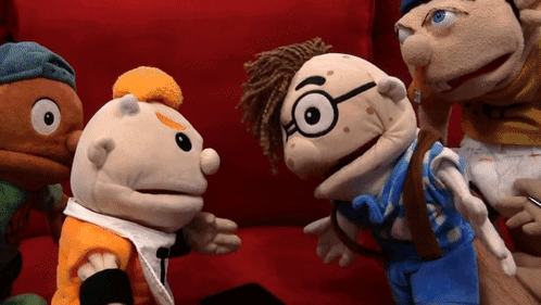 Joseph watches as Junior and another puppet burst into hysterical laughter on a red couch.