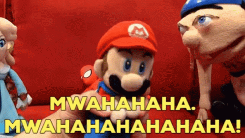 SML Mario puppet delivers a maniacal laugh, joined by other puppets in a humorous scene.