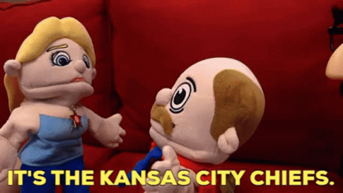 Sml Marvin and another puppet discuss the Kansas City Chiefs while sitting on a red couch.
