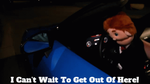 SML's Mr. Goodman puppet is in a blue car at night, expressing "I Can't Wait To Get Out Of Here!".