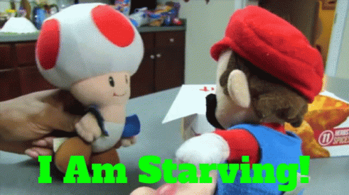 SML Toad and Mario plushies are shown, with Toad exclaiming 'I Am Starving!' in a humorous scene.