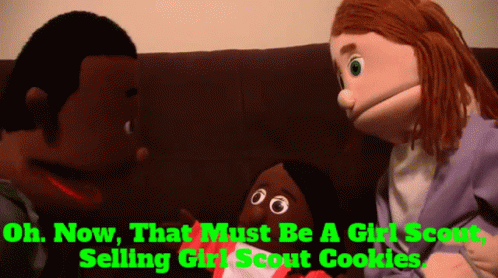 Sml Tyrone and other puppets discuss a Girl Scout selling cookies, featuring the text 'Oh. Now, That Must Be A Girl Scout, Selling Girl Scout Cookies.'