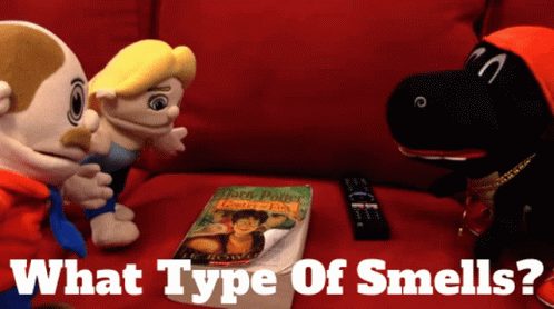 SML's Ya Boy Duggie and friends discuss 'What Type Of Smells?' with a Harry Potter book nearby on a red couch.