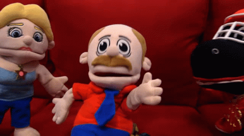Ya Boy Duggie, a puppet in Kansas City Chiefs gear, talks with other SML puppets on a red couch.
