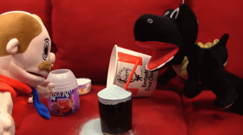Sml character Ya Boy Duggie drinks from a cup on a red couch, with Kool-Aid nearby.
