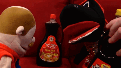 a bottle of pearl milling company original syrup is next to a stuffed animal