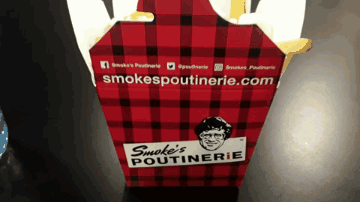 A close-up of a delicious Smoke's Poutinerie classic poutine with fries, cheese curds, and gravy.
