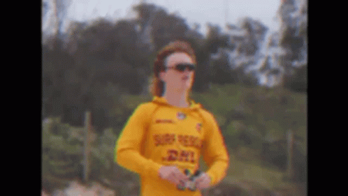 A surf rescuer with a mullet and sunglasses checks his remote, then shrugs as someone struggles in the ocean.