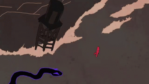 A stylized animation featuring a giant snake attacking a falling tower, with a small figure fleeing, by The Imbeciles.