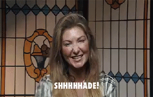 A woman with long hair smiles, snaps her fingers, and exclaims 'SHHHHHHADE!' with sass.