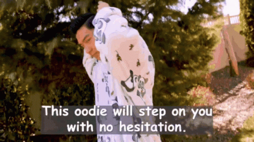 Man wearing a Snaxbreak Oodie with a bold message: 'This oodie will step on you with no hesitation.'