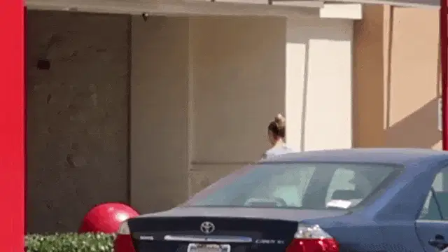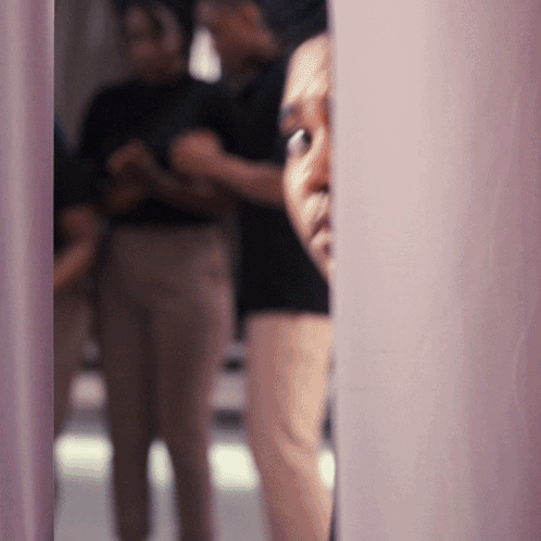 Anjelika Washington as Jess peeks from behind a pink curtain with a surprised expression.