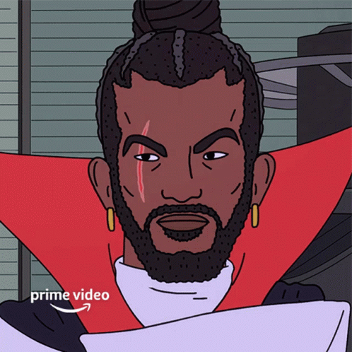 Animated character Hiroki Hassan with a man bun, beard, and scar, looking intently.
