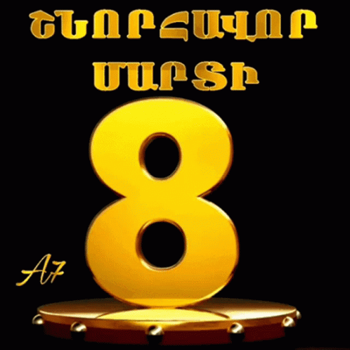 A golden 3D number 8 rotates on a pedestal, celebrating March 8th, International Women's Day.