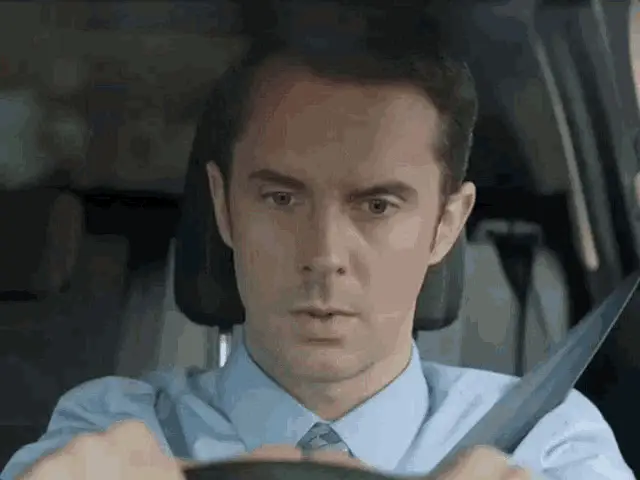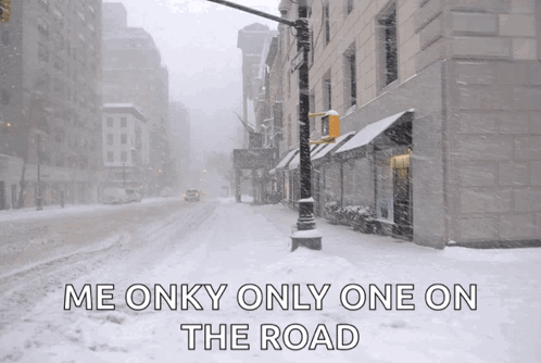 A deserted city street during a heavy snow blizzard, with a car driving through the thick snow.