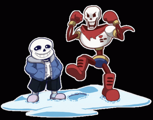 Sans and Papyrus from Undertale standing in the snow, with Papyrus making a fist pump and a footprint.