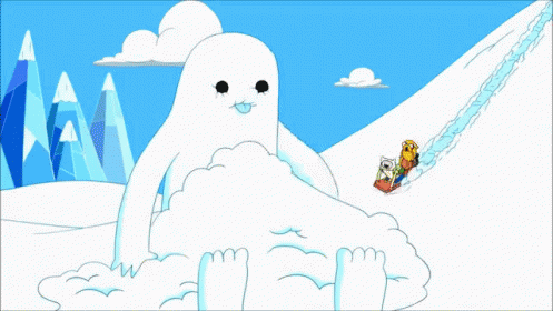 A cute snow creature, resembling a cat, emerges from a pile of snow in a winter landscape from Adventure Time.