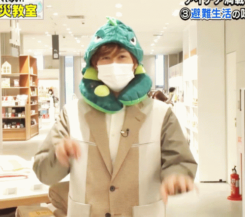 Snow Man's Abe Ryohei in a dinosaur hat, wearing a mask and making a 'rawr' gesture in a store.