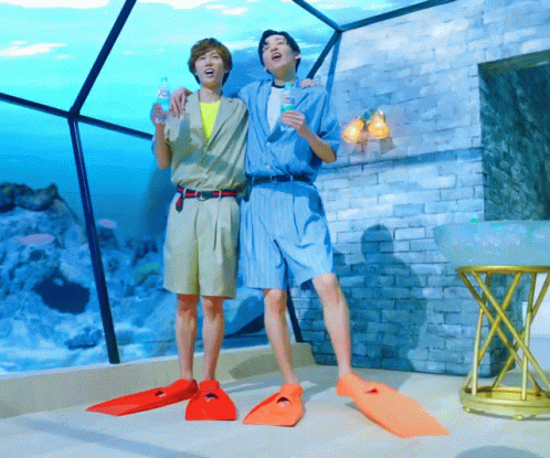 Snow Man members Abe Ryohei and Meguro Ren in colorful flippers, holding drinks in an aquatic-themed setting.