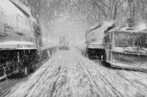 Heavy snow falling as two snow plows clear tracks, with a third vehicle in the distance during a winter storm.