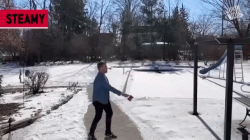 Man throws hot water into freezing air, instantly creating a spectacular cloud of steam and ice crystals.