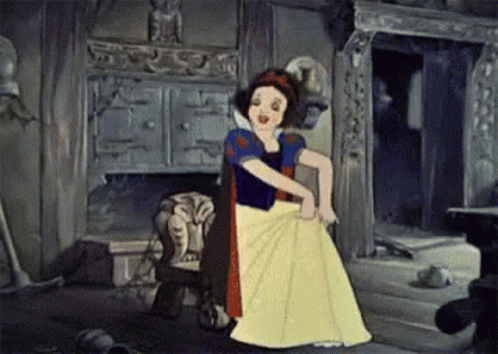 Snow White happily dancing and holding her skirt in a classic Disney animation.