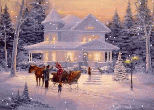 A horse-drawn sleigh arrives at a beautifully lit house on a snowy Christmas Eve, surrounded by pine trees.
