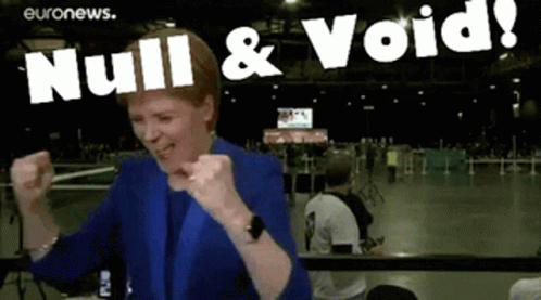 Nicola Sturgeon reacts with excitement to 'Null & Void!' news, raising her fists in celebration.