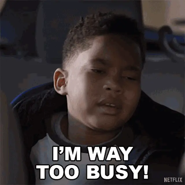 Goldie Chan, with vibrant green hair, expresses being 'SO BUSY' in front of a 'Global Management' sign.