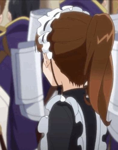 Anime character Silvia (Shirubia) in a maid outfit, transitions from smiling to an adorable chibi-style cry.