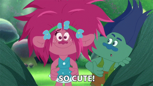 Poppy and Branch from Trolls react with excitement, with Poppy exclaiming 'So Cute!' in an adorable moment.