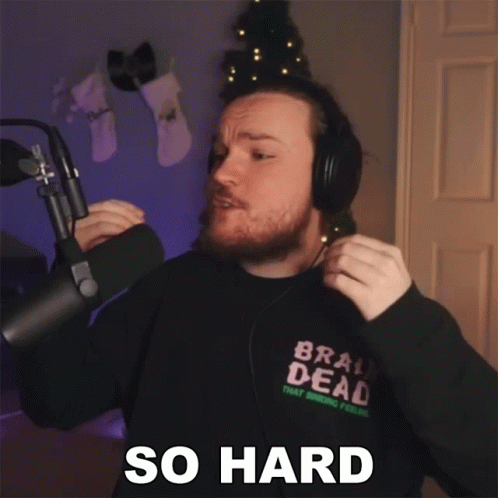Spaceboy, a man wearing headphones and a "Brain Dead" shirt, exclaims "SO HARD" with intense emotion.