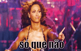 Beyoncé points with a playful expression, featuring the Portuguese phrase 'Só Que Não' (But no).