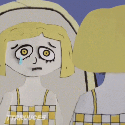 A paper cutout cartoon girl with yellow hair cries, with text overlay 'Lonely and sad Over you... Happy now???'