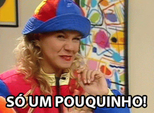 Brazilian TV personality Angelica, in a colorful hat, makes a 'wait' gesture while saying 'Só um pouquinho!'