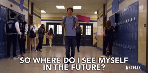A young man from Daybreak asks 'So where do I see myself in the future?' while walking in a school hallway.
