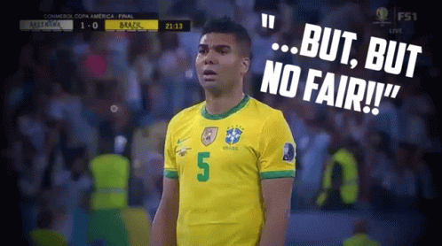 A Brazilian soccer player in a yellow jersey with number 5 reacts with frustration, exclaiming 'But, but no fair!!' during the CONMEBOL Copa América Final.