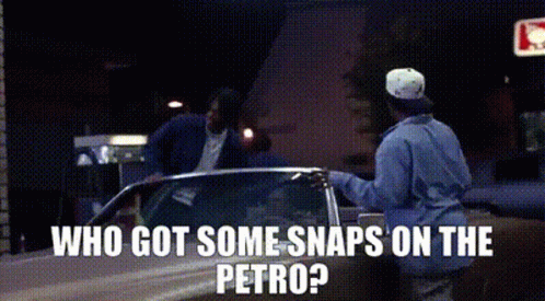 A man asks 'Who got some snaps on the Petro?' at a gas station at night, near a Jack in the Box.
